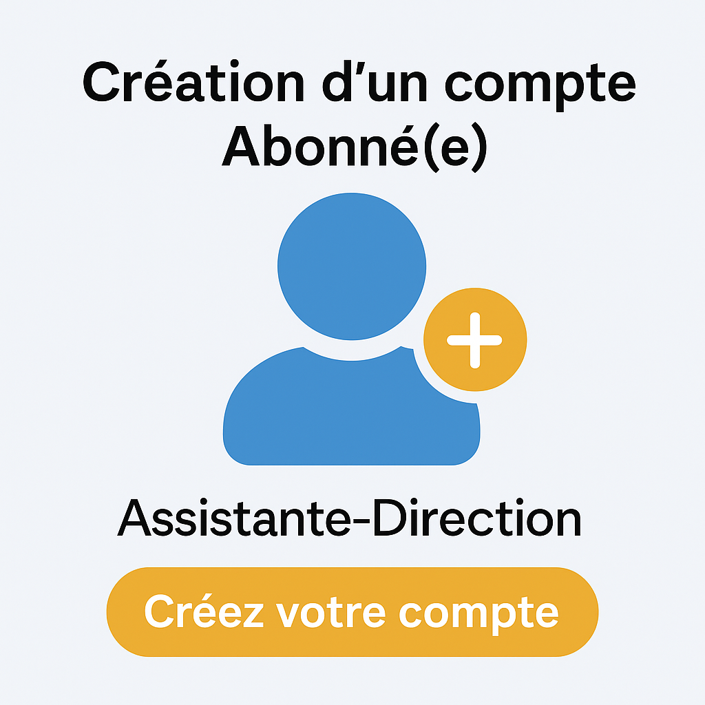 Le service Création de compte Abonné(e) sur Assistante‑Direction permet aux utilisateurs de s’abonner et d’accéder à des contenus réservés, services exclusifs ou fonctionnalités avancées du site. En devenant abonné(e), vous bénéficiez d’un espace membre personnalisé et de privilèges dédiés.